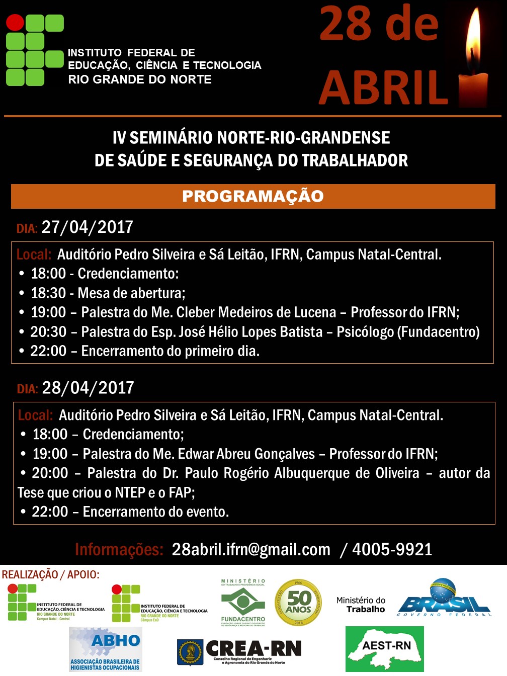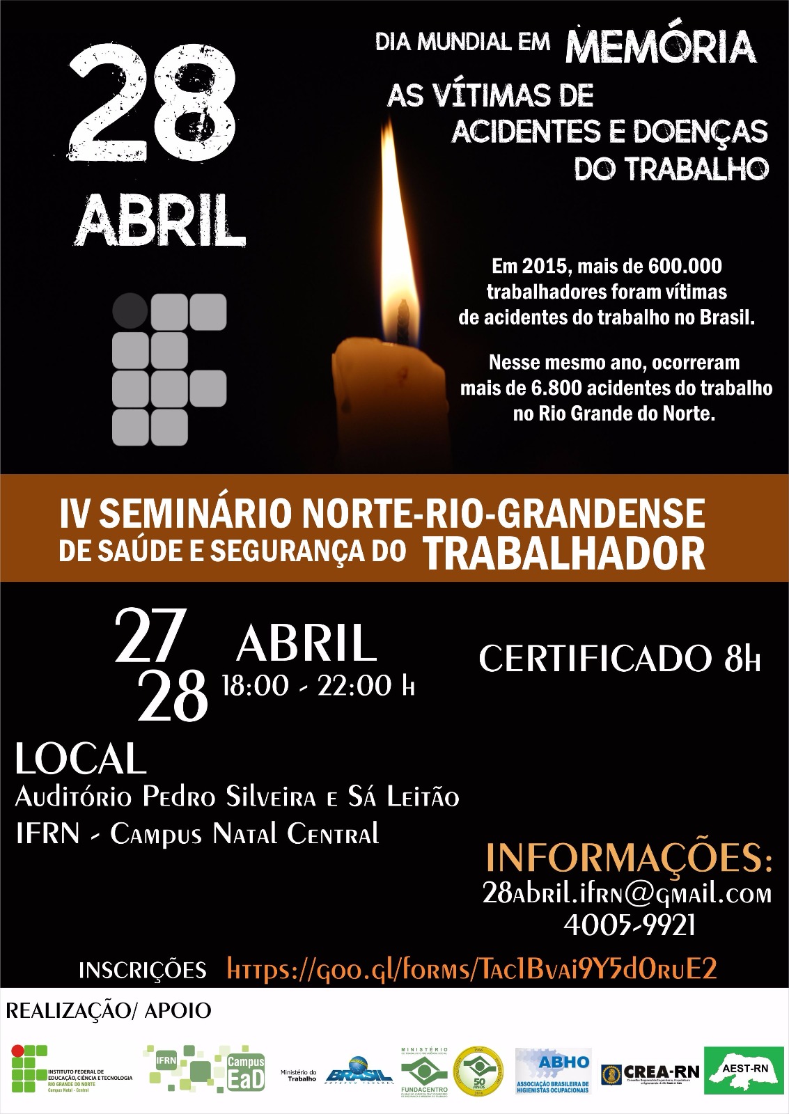 Fórum AT divulga: IV Seminário Norte-Riograndense de Saúde e Segurança do Trabalhador . . Leia mais sobre Fórum AT divulga: IV Seminário Norte-Riograndense de Saúde e Segurança do TrabalhadorEfetue login ou registre-se para postar comentários