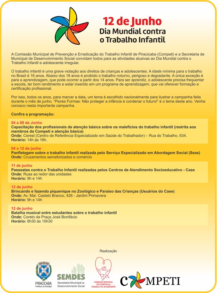 Veja aqui convite para evento rganizado pela Comissão Municipal de prevenção e Errradicação do trabalho infantil de Piracicaba.