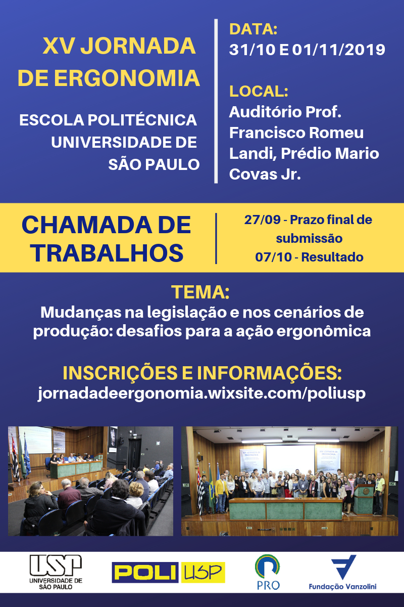 Nos dias 31 de outubro e 01 de novembro de 2019, será realizada, no Auditório Professor Francisco Romeu Landi (Prédio Mário Covas), a XV Jornada de Ergonomia da Poli/USP. Coordenada pelos Profs. Drs. Laerte Sznelwar, Uiara Montedo e Fausto Mascia (PRO), a edição deste ano terá como tema: Mudanças na legislação e nos cenários de produção: desafios para a ação ergonômica.
