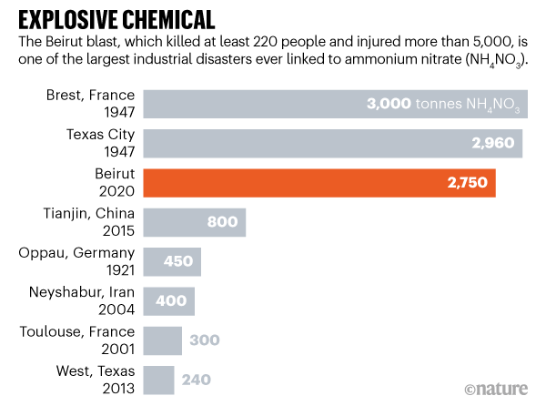 The blast is one of the largest accidental ammonium nitrate explosions ever recorded (see ‘Explosive chemical’) — so powerful that it was heard more than 200 kilometres away in Cyprus. The sheer amount of ammonium nitrate involved is “nuts, insane, huge”, says Andrea Sella, a chemist at University College London.