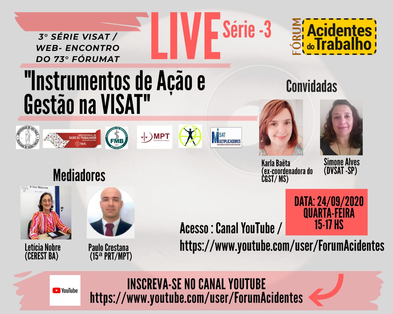 No dia 24/09 (quinta-feira), às 15h: iremos discutir as estratégias e resultados na área programática da Saúde do Trabalhador sob a perspectiva dos diferentes níveis de gestão. Com a participação das convidadas Karla Baêta (Ex- Coordenadora do CGST/ MS) e Simone Alves dos Santos (DVST-SP), e mediação de Letícia Nobre (CEREST Bahia) e dr. Paulo Crestana (15ª PRT/ MPT).