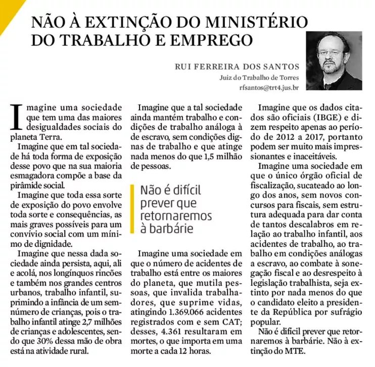 Não à extinção do Ministério do Trabalho e emprego Juiz do Trabalho se posiciona contra o fim do Ministério do Trabalho e Emprego Leia mais sobre Não à extinção do Ministério do Trabalho e empregoEfetue login ou registre-se para postar comentários