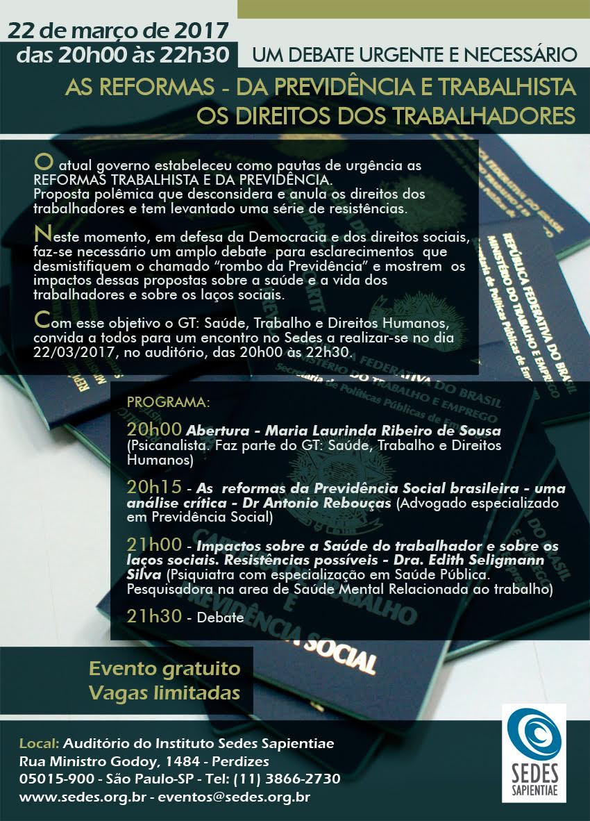 Debate urgente e necessário sobre as Reformas da Previdência e Trabalhista sobre os direitos dos Trabalhadores.DIA: 22 de março de 2017HORÁRIO: das 20:00hrs às 22:30 hrsLOCAL: Auditório do Instituto Sedes Sapientiae .Rua Ministro Godoy, 1484 - Perdizes. Para mais informações veja o FOLDER Efetue login ou registre-se para postar comentários
