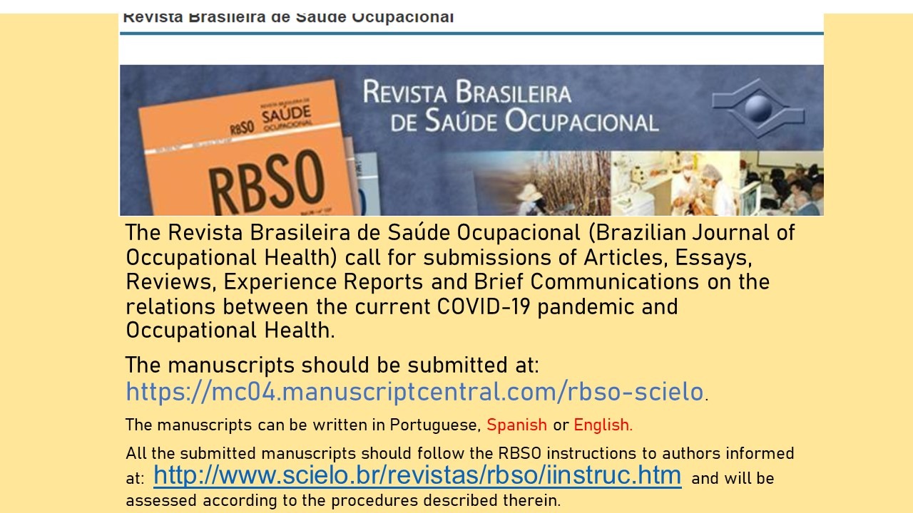 A REVISTA BRASILEIRA DE SAÚDE OCUPACIONAL (RBSO) da Fundacentro lançou chamda de artigos sobre o tema COVID-19