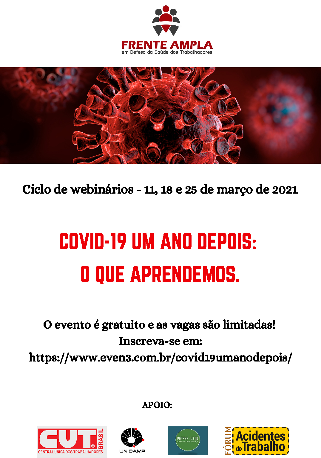 Neste contexto desafiador, o Grupo de Trabalho no. 2 (GT2) da Frente Ampla, dedica-se à temática “Ampliação do conceito de covid-19 relacionada ao trabalho: ações necessárias e recomendadas para avançar”, com produção contínua de orientações e eventos. Nos dias 11, 18 e 25 de março, o GT2 lança um ciclo de webinários para discutir o que aprendemos um ano depois da declaração da pandemia.