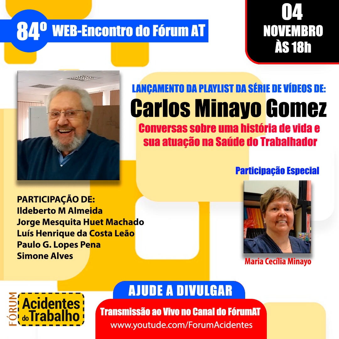 No dia 04 de novembro, às 18horas teremos o 84º Encontro do Fórum AT para o lançamento da playlist, ou seja, de uma série de videos gravados no segundo semestre de 2020 com um dos pilares da construção da área de Saúde do trabahador no Brasil. O professor Carlos Minayo Gomez.