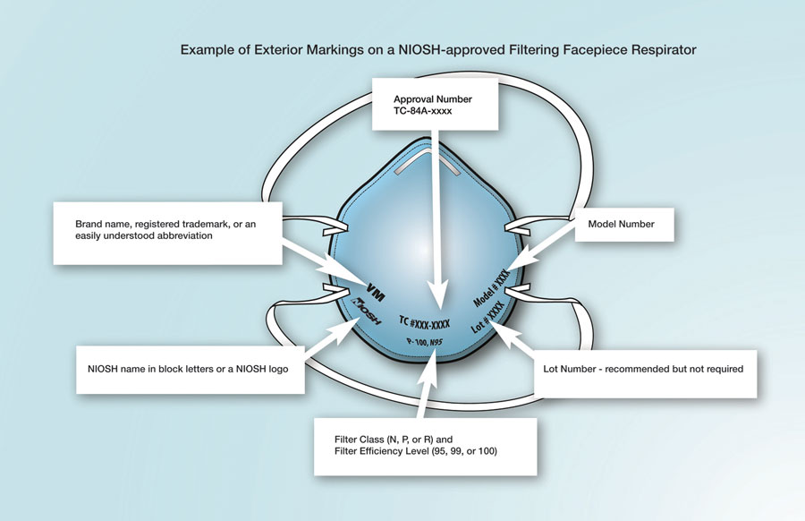 Make sure to check the respirator approval markings using the Example of Correct Exterior Markings on a NIOSH-Approved Filtering Facepiece Respirator graphic.