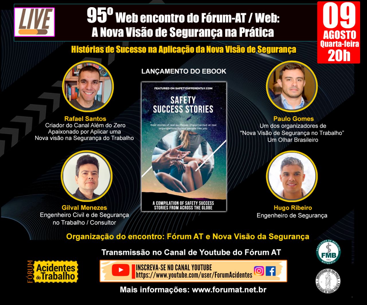 Fórum AT vai promover seu 95 º encontro. Será na quarta feira, 09 de agosto, às 20h. Na ocasião pesquisadores brasileiros que participaram na elaboração do EBOOK Safety Success Stories vão apresentar os temas sobre os quais escreveram na obra. Trata-se de obra cuja publicação foi promovida pelo site https://safetydifferently.com/ Vale a pena visitar a página e conhecer mais sobre essa abordagem. Vejam os nomes dos nossos convidados no Cartaz. O link de acesso ao livro é https://lnkd.in/db6arsWi