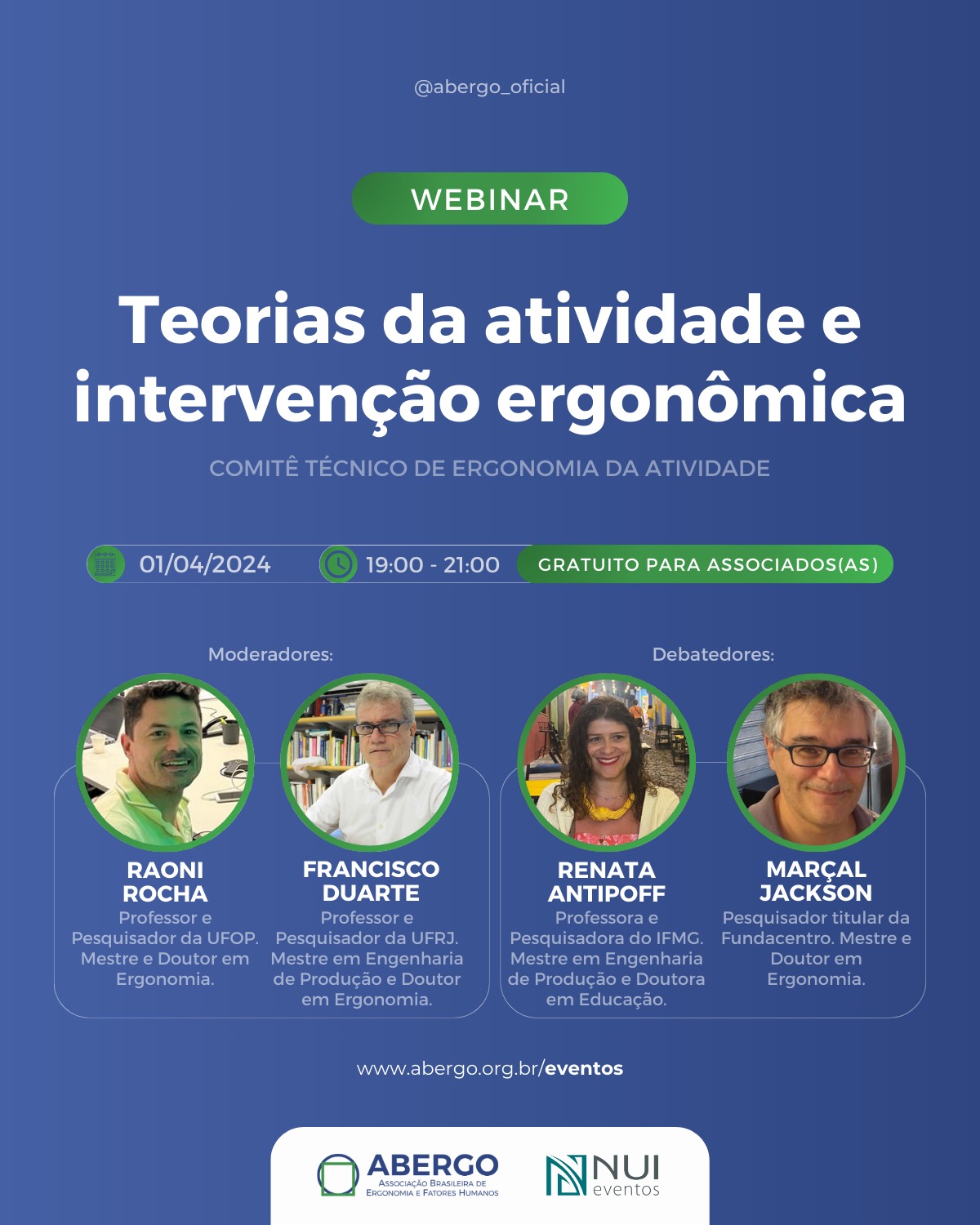 Dia 01/04 às 19:00 faremos nosso 1o webinar, com Renata Antipoff, Marçal Jackson, Raoni Rocha e Francisco Duarte. Vamos discutir teorias da atividade e a relação com a transformação das situações de trabalho.