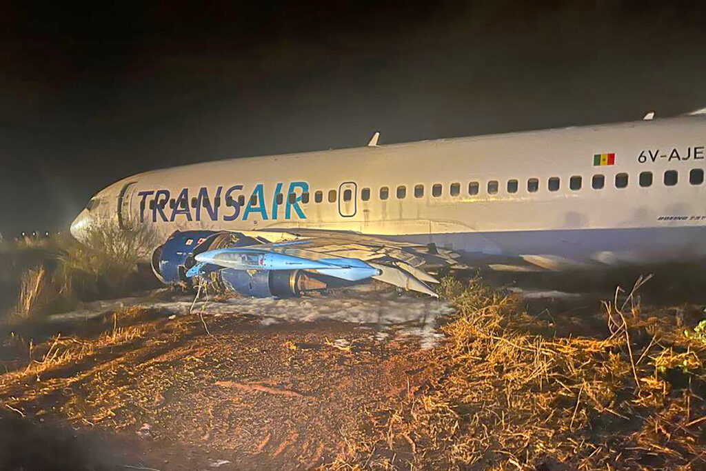O avião do modelo 737-300 é da TransAir, e decolava da capital senegalesa de Dacar para Bamaco, no vizinho Mali. Por algum problema, a aeronave saiu da pista e colapsou aparentemente o trem de pouso, com os motores sendo bastante danificados ao encostarem no chão.