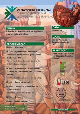 Convidamos a todos para participarem no dia 4 de Novembro, em São João del Rei-MG, do XVI Encontro Presencial do Fórum Interdisciplinar de Saúde Mental e Trabalho. A entrada é gratuita, com emissão de certificados. Segue, nossa programação, esperamos por vocês!